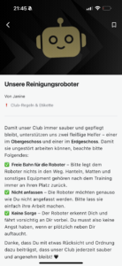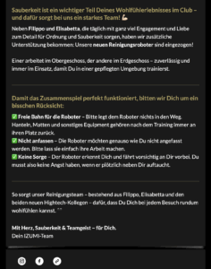 👉🏻 In der MySports App ist ab sofort ein Artikel unter Club-Etikette mit den Regelungen zu unseren Reinigungsrobotern online.