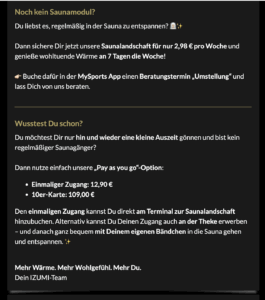 Der Zugang funktioniert den gesamten Tag – das Mitglied kann mehrfach am selben Tag in die Saunalandschaft.