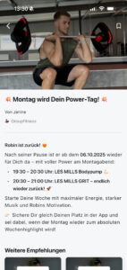 👉🏻 Wichtig: Der GRIT-Kurs lief früher freitags – wir probieren ihn jetzt montags direkt nach Bodypump aus. Bitte seid darauf vorbereitet, dass Mitglieder nachfragen, und verweist aktiv auf die App-Buchung.